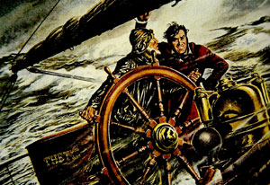 | Wagner neben dem Steuermann auf der Thetis. Sie trotzen einem Sturm im Skagerrak, so wie es sich der Illustrator von National Geographic (1944) vorstellt. |